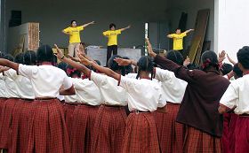 Pratique de groupe des professeurs et des élèves de l'École Vidya Jyothi |