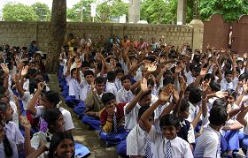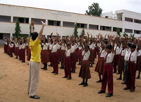 Professeurs et élèves dans l'École Vidya Jyothi attendaient en plein soleil pour apprendre les exercices