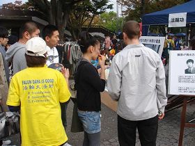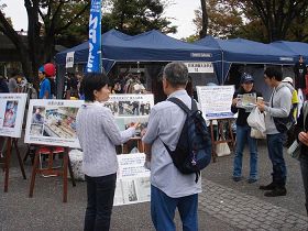 La prestation des pratiquantes sur scène, la révélation de la persécution brutale en Chine, et l'enseignement des exercices ont été chaleureusement accueillis par les passants. De nombreuses personnes voulaient en savoir plus sur la persécution en Chine après avoir vu les photos et lu l'information présentée. Un Japonais âgé a dit "Le Parti communiste chinois est pire que la Corée du Nord. Il y aura encore des souffrances si la dictature du PCC ne prend pas fin. Je soutiens Falun Gong."