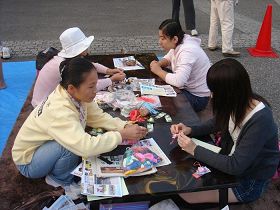 Une pratiquante a enseigné à une fillette japonaise comment plier les fleurs de lotus de papier et lui a dit "Les fleurs de lotus vivent dans la boue mais elles restent immaculées et élégantes. Vois-tu les trois caractères chinois sur les petits marque-pages. Authenticité, c'est être vrai, dire la vérité, la compassion c'est avoir bon cœur, tolérance c'est être patient et endurant. Si tu peux suivre ces principes, tu seras une bonne personne. Les pratiquants de Falun Gong suivent ces principes quels que soient les changements d'environnement et même lorsqu'ils sont persécutés."