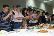 Après la cérémonie, il y a eu un banquet avec cinquante sept tables remplies de plats des cinq principaux systèmes de cuisine. Une révélation pour les invités ! Les plats comportaient: de l’oie relevée avec du vin de Shaoxing, des tripes de boeuf épicées, de la salade de champignon à l’huître, des rouleaux de crevettes style cantonnais, du sauté de palourdes avec sauce XO, de la soupe épaisse avec du chrysanthème et de la viande en lamelle avec des légumes, du concombre de mer parfumé à l’échalote, du canard salé fumé avec du thé lauraceous, des boulettes de crevettes cuites dans la friture, du porc relevé aux épices à la façon royal, du calamar kongpao, de la pomme de terre sautée avec du piment séché, de la pâte frite avec des oignons et de la garniture de fruits de mer, du sauté de filet d’anguille, des coquilles Saint-Jacques séchées avec du choux chinois, de la crème d’amande et des fruits de saison.