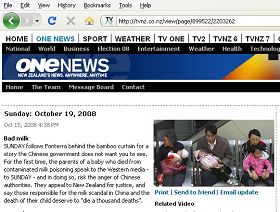 Le 19 octobre 2008, le programme ‘’Dimanche’’ de la TV de Nouvelle Zélande a diffusé un reportage spécial sur le scandale du lait frelaté en Chine (Copie d’écran) |