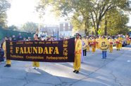 La parade a commencé le matin à 8h30. Derrière la grande bannière portant les mots "Falun Dafa", trois pratiquants tenaient des bannières circulaires où on pouvait lire "Vérité", "Compassion", et "Tolérance". Ils ont joué des tambours de style Tang et fait des démonstrations des exercices du Falun Gong sur un char.