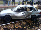 Soudain le bruit du trafic s'est apaisé. Je ne pouvais plus voir aucune voiture venant de la direction opposée. Alors que j'essayais de comprendre ce qui s'était passé, un objet géant est sorti de nulle part et a défoncé ma voiture sur l'avant de l'aile gauche. Ma voiture a été forcée en arrière. J'ai essayé de voir ce qui poussait ma voiture mais je ne pouvais pas comprendre--c'était trop près et trop haut. J'ai fermé les yeux pour m'assurer de ne pas rêver et quand je les ai ré ouverts, j'ai vu deux rails à travers mon pare-brise. J'étais sur une voie ferrée !