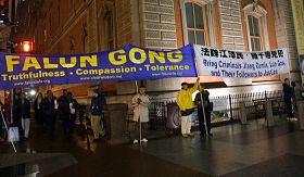 L’après-midi du 14 novembre 2008, le chef du Parti communiste Chinois, Hu Jintao et son entourage sont arrivés à Washington DC pour assister au sommet du G20 sur les marchés financiers et l’économie mondiale. Les pratiquants de Falun Gong de la grande région de Washington DC se sont retrouvés près de la Maison Blanche avec des banderoles transmettant les messages : ‘’Cessez immédiatement la persécution du Falun Gong par le Parti communiste Chinois,’’ et ‘’Traduisez en justice les criminels Jiang Zemin, Luo Gan, et ceux qui les suivent ", exprimant leur opposition à la persécution déjà longue de neuf ans.