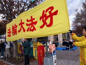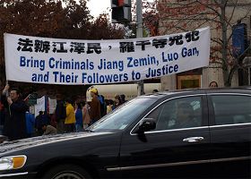 Le 16 novembre 2008, le dirigeant chinois Hu Jintao a terminé sa visite de trois jours à Washington, D.C. Les pratiquants de Falun Gong de DC se sont réunis devant l'hôtel de Hu et ont tenu des banderoles disant « Falun Dafa est bon », « Traduisez Jiang Zemin, Luo Gan, Zhou Yongkang et Liu Jing en justice », « Aidez à arrêter la persécution du Falun Gong ». Les pratiquants ont présenté les exercices et davantage de gens ont entendu parler du Falun Gong.