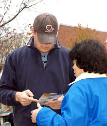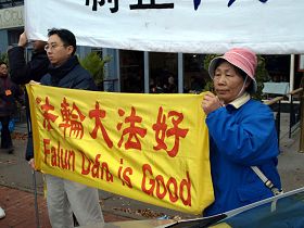 Le 16 novembre, la température a chuté nettement. Presque cent pratiquants de Falun Gong ont manifesté devant l'hôtel Marriott. La manifestation paisible a attiré beaucoup de gens qui ont demandé des renseignements. Les gens organisés par l'ambassade de Chine pour saluer Hu observaient également les actions des pratiquants.