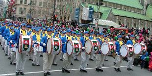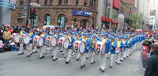 La Fanfare de la terre divine des pratiquants de Falun Dafa performe dans la Parade de Noël de Montréal.