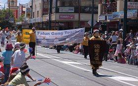 Les pratiquants de Falun Gong ont été invités à participer à la fête, cette année encore, et ont fourni un merveilleux coloré au défilé. Sur un char magnifiquement décoré, des fées célestes et des jeunes femmes en costumes de la dynastie Tang ont montré les exercices du Falun Gong, alors que l'annonceur a présenté les principes de, Authenticité-Bienveillance-Patience. Les spectateurs ont applaudi avec enthousiasme et beaucoup de gens ont pris des photos et des vidéos des pratiquants.