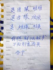 Alors que la troupe était en train de jouer, un touriste chinois a glissé un morceau de papier dans la main d'un pratiquant. Ce dernier a d'abord pensé que c'était de l'argent. Mais ça s'est avéré être une note écrite en chinois simplifié "Je quitte la Ligue de la Jeunesse et les Jeunes Pionniers.- MInging. Je quitte la Ligue de la Jeunesse et les Jeunes pionniers. - Xuxu. Je quitte les Jeunes Pionniers. - Guiying. Je veux le livre Zhuan Falun mais ne sais pas où l'acheter."