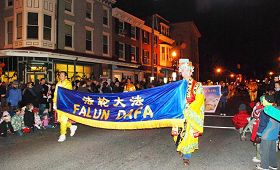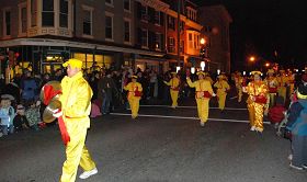 C'était une nuit froide, mais les spectateurs ont été très enthousiastes. Les familles se sont alignées très tôt, le long des rues du parcours. Le cortège du Falun Gong a été le seul groupe qui a représenté la culture asiatique. Quand la fanfare de tambourins de ceinture a descendu la rue accompagnée de la musique de « Falun Dafa est grand, » les gens ont applaudi et félicité. Le Falun Gong a apporté à West Chester de l'information au sujet de la pratique ainsi que du Spectacle de la Divine Performing Arts qui sera tenu à Philadelphie. Certains ont dit que c’était la première fois qu'ils entendaient parler de la DPA. D'autres ont dit qu’ils avaient déjà reçu des informations au sujet du spectacle. Beaucoup ont dit que c’était très beau, et qu’ils ne le manqueraient pas.