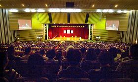 À l'aube, des centaines de voitures de tourisme et de petites camionnettes de tout Taïwan sont arrivées à l'Université nationale de Chung Hsing et les pratiquants, habillés de façon formelle, sont entrés dans la salle de conférence. Il y avait également cinq salles secondaires pour recevoir le grand nombre de pratiquants. Au centre de la salle principale se trouvait une banderole immense avec le texte de Lunyu en caractères dorés sur fond rouge. Des deux côtés de l’immense banderole se trouvaient des banderoles avec l’emblème du Falun en différentes couleurs. L'atmosphère dans la salle de conférence était respectueuse et solennelle.