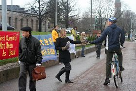 C'était aussi le jour de la rencontre plénière du parlement de Finlande. Certains membres du parlement et des piétons sont passés devant les pratiquants. Ils ont accepté les imprimés clarifiant les faits et levé le pouce saluant à leur façon la persévérance des pratiquants sous la pluie et la neige.