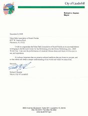 Lettre de félicitations du maire de Lauderhill, Richard Kaplan.