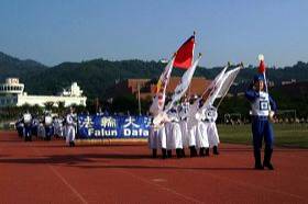 Au cours de la cérémonie d’ouverture, la fanfare de la Terre Divine a conduit les drapeaux de la nation, de la ville et des organismes participants à cet événement jusque dans le stade. Quand la musique de « Falun Dafa est bon » a commencé, la foule a été dynamisée.