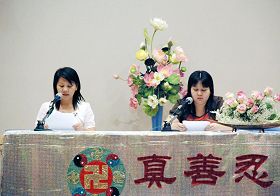 Lors de la session de l’après-midi, les jeunes pratiquants de l’Ecole Minghui sont montés sur l’estrade pour réciter un passage de Zhuan Falun : "La Conscience principale doit être forte" sous les vifs applaudissements de l’assistance.