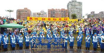 Les pratiquants de Falun Dafa forment l’image d’un jeune pratiquant émettant la pensée droite près du Lac Chung-Hsing à Taichung pour souhaiter une Heureuse Année chinoise au Maître!