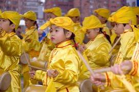 Les jeunes pratiquants de Falun Dafa de l’École Minghui donnent une représentation de tambourins de ceinture