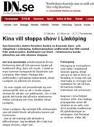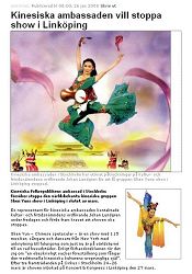 Selon les reportages, l'Ambassade chinoise a essayé d'empêcher le Spectacle du Nouvel An Chinois d'avoir lieu dans la ville de Linkoping. Un fonctionnaire des Services culturels suédois a reçu un appel de l'Ambassade de Chine. Le message était très clair : si la performance ne peut pas être annulée, la relation entre la Suède et la Chine sera affectée.