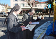 "Vérité, Compassion et Tolérance sont le Critère pour ce monde. Que vouloir encore s’ils rejettent cela ? ". ? , ont répondu les nonnes et elles ont signé la pétition. Puis elles sont restées regarder avec grand intérêt les pratiquants qui faisaient les exercices et ont posé beaucoup de questions, comme combien de temps dure la méditation assise et pourquoi utilise-t-on la posture de la main de lotus et plus encore. Les pratiquants ont répondu à toutes leurs questions. En partant elles ont pris un formulaire de pétition vierge afin de le faire signer par d’autres personnes.