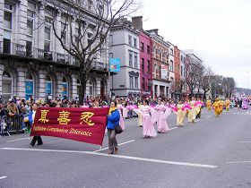 Le Jour de la Saint Patrick est le jour de la Fête nationale pour la République d'Irlande et le pays tout entier était plein d'une atmosphère de fête. Après avoir assisté au Grand défilé de la fête nationale à Cashel le 15 mars, les pratiquants de Falun Gong ont aussi répondu à l'invitation à participer au défilé de la fête nationale à Cork le 17 mars. Ils ont remporté le prix du meilleur groupe de danse pour les belles danses chinoises traditionnelles qu'ils ont présentées durant le défilé.