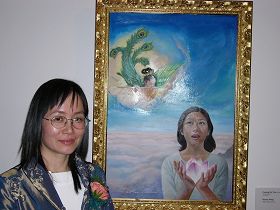 L’artiste Humin Wang à côté de sa peinture « Venue pour vous ». Madame Wang a été illégalement détenue à plusieurs reprises lorsqu’elle vivait en Chine