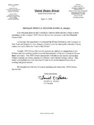 Le sénateur Akaka a dit : « C'est avec grand plaisir que j’offre mon aloha le plus chaleureux et mes meilleurs vœux à tous les spectateurs qui assisteront ce soir à cette Première du Spectacle chinois 2008 dans la salle de concert Neal Blaisdell.
