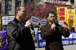 Zeng Wenbiao, représentant du Centre de démission du PCC du Nord de la Californie et Zang Xinyu, informaticien dans la région de la Baie, prennent la parole lors du rassemblement