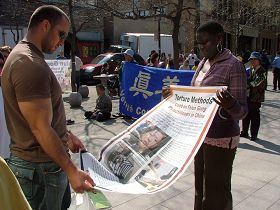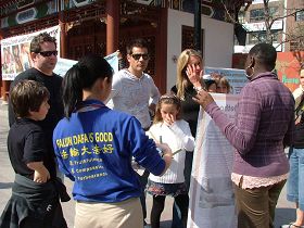 Samedi le temps était doux et comme un grand nombre de gens étaient venus faire des courses dans le quartier chinois, les pratiquants ont manqué de formulaires pour la campagne des « Millions de signatures », lancée par la Coalition d’investigation sur la persécution du Falun Gong (CIPFG). Beaucoup de gens dans la foule entendaient parler de la pratique pour la première fois et ont noté les adresses des sites locaux de pratique, disant qu’ils voulaient apprendre à pratiquer également. Deux femmes se sont jointes au groupe d'exercices ce jour-là.
