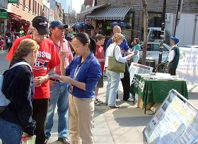 Depuis ces dernières neuf années, de plus en plus de gens ont appris les faits et sont maintenant capables de distinguer le bon du mauvais grâce aux efforts fermes des pratiquants pour clarifier la vérité. Quand un Chinois travaillant dans un restaurant du quartier chinois a longé le rassemblement, il a dit aux pratiquants qui distribuaient des brochures, « Le Falun Dafa est bon! »