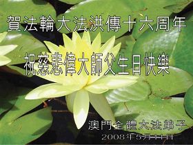 Les pratiquants de Macao souhaitent respectueusement un Joyeux Anniversaire au Vénérable et bienveillant Maître et célèbrent le 16 iem anniversaire de l’introduction du Falun Dafa au public!