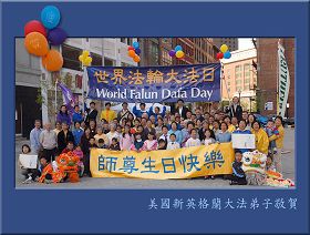 Les pratiquants du Texas souhaitent respectueusement un Joyeux Anniversaire au Vénérable Maître et célèbrent le 16 iem anniversaire de l’introduction du Falun Dafa au public et la Journée mondiale de Falun Dafa!!