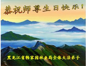 Les pratiquants dans le bureau forestier de Hanjiayuan, province du Heilongjiang, souhaitent respectueusement au Maître révéré un joyeux anniversaire!