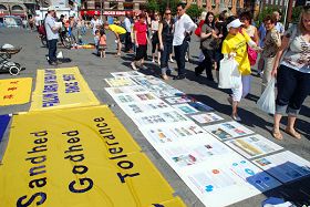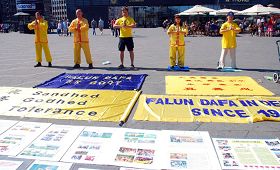 Dans l'après midi du 11 mai, des panneaux et des bannières présentant le Falun Gong sont apparus sur la place de l'hôtel de ville de Copenhague. Les panneaux retraçaient le parcours du Falun Gong à travers le monde depuis 1992. On pouvait lire sur les bannières "Vérité, Compassion, Tolérance" et "Falun Dafa au Danemark depuis 1997". Les pratiquants ont aussi confectionné des fleurs de lotus de papier portant le message "Falun Dafa est bon"