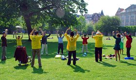 Le matin du 12 mai, les pratiquants de Falun Gong se sont rendus à King's park à Copenhague pour une pratique collective. Ces dix dernières années, les pratiquants de Falun Gong ont enseigné gratuitement les exercices à cet endroit. Trois ou quatre personnes sont venus apprendre les exercices ce jour-là dont un artiste norvégien.