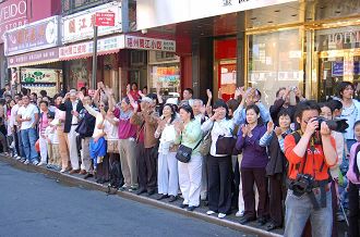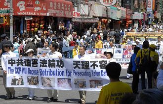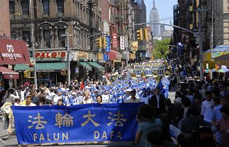 Plus de 2 000 pratiquants de Falun Gong ont organisé un grand défilé dans le Chinatown de Manhattan à midi le 25 mai 2008. Ils ont célébré la diffusion du Falun Gong dans plus de 80 pays à travers le monde et tenu d’énormes banderoles avec des messages condamnant le Parti communiste chinois (PCC) qui tire profit d'une tragédie comme le tremblement de terre du Sichuan pour intensifier la persécution.