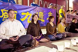A l'extérieur du consulat chinois à New York, les pratiquants ont montré les banderoles, « Commémorer le neuvième anniversaire de l'appel du 25 avril », et, « Arrêter la persécution du Falun Gong ». Des pratiquants ont présenté les exercices du Falun Gong. Des bougies allumées devant le groupe formaient deux caractères chinois « La rectification par la Loi ».