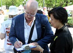 Cela fait neuf ans que le PCC a lancé sa brutale persécution de ces pratiquants qui croient en "Vérité, Compassion, Tolérance". Il est difficile pour beaucoup de suédois de comprendre comment cela a pu arriver. Mais ils faisaient la queue pour signer la pétition "Millions de Signatures" pour 2008 initiées par la Coalition d’ Investigation sur la Persécution du Falun Gong en Chine (CIPFG). La CIPFG est composée de plus de 400 parlementaires, avocats et autres personnes des cinq continents.