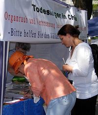 Deux sœurs adolescentes ont attentivement regardé les panneaux d’information et immédiatement signé la pétition contre la persécution. L’une d’elle a dit : " Nous avons vu ces photos (au sujet de la persécution) et nous espérons aider à mettre fin à tout cela. Le prélèvement d’organes à vif doit cesser et il et nécessaire de prendre des mesures. Collecter des signatures comme vous le faites est excellent. J’espère que ça aura un véritable effet et je souhaite que vous réussissiez ! "