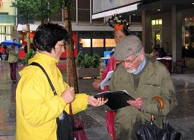 La jolie ville de Lugano, qui est située en suisse italienne, est une destination touristique prisée. Le 17 mai, les pratiquants de Falun Dafa ont installé un stand au centre ville. Malgré une pluie continuelle, beaucoup de gens sont passés et ont pris l'information clarifiant les faits offerte par les pratiquants, puis la plupart ont spontanément signé une pétition de soutien. L'activité s'est conclue à 17h avec une expression sincère de gratitude pour le Maître, par tous les pratiquants de Dafa présents.