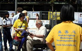 Le 12 mai 2008, les pratiquants hollandais ont tenu des activités à Rotterdam pour célébrer la journée mondiale de Falun Dafa. Durant la célébration de ce festival, ils ont exposé des photos, fait des démonstrations des exercices et fait signer des pétitions pour éveiller les consciences au sujet de la persécution se produisant en Chine. De nombreuses personnes ont vu l'harmonie et la bonté du Falun Gong et pu apprendre la vérité de la persécution du Falun Gong par le PCC. L'un après l'autre, ils sont venus signer la pétition demandant la fin de la persécution.