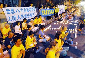 La veillée aux bougies a commencé à 19h. Les pratiquants se sont alignés le long du boulevard Kissena à Flushing, tenant d'immenses bannières où on lisait : "Falun Dafa est bon" (Falun Dafa Hao), "Le monde a besoin d' "Authenticité-Bienveillance-Patience (Zhen Shan Ren)", "Pleurons les dizaines de milliers de victimes du fort tremblement de terre dans le Sichuan, face au désastre national, pourquoi ne pas arrêter de persécuter des centaines de milliers de gens innocents", et ainsi de suite.