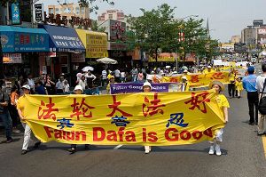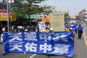 Démarrant de la rue Principale et de la 41ème rue, le défilé a traversé la rue Principale et l’avenue Franklin, et a fini à la bibliothèque municipale de Flushing sur le boulevard Kissena. Le défilé était divisé en 6 groupes avec différents thèmes, y compris la Fanfare de la Terre divine, l’introduction du Falun Dafa, résister à la persécution, la croissance du Falun Dafa autour du monde, les neuf commentaires et les démissions du PCC. En dépit du temps chaud, beaucoup de passants se sont arrêtés pour regarder. En voyant ce grand défilé et en étant les témoins de la compassion et de la sérénité des pratiquants, en dépit de l'interférence occasionnelle de quelques pro-communistes, beaucoup de passants ont été touchés et ont eu des réactions positives. Une jeune femme qui a regardé le défilé pendant longtemps a dit : « C'est la première fois que je rencontre le Falun Gong et ce grand défilé est très émouvant. Tout ce que j'ai entendu en Chine était de la propagande contre la pratique. Aujourd'hui, je suis très heureuse de voir comment ils sont. La compassion montrée par le défilé est très touchante. »
