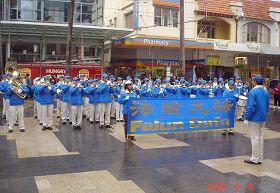 Malgré la bruine, les pratiquants de Falun Gong ont présenté les exercices et ont distribué des dépliants de clarification de la vérité. La fanfare de la Terre divine a joué de la musique et les danseuses ont présenté des danses traditionnelles chinoises.
