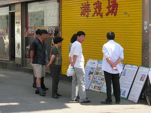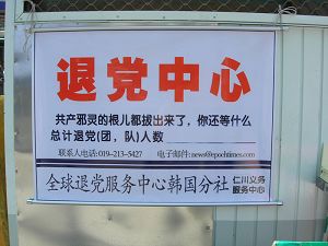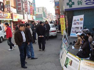 Plusieurs pratiquants de Falun Dafa dont moi-même avons établi un Bureau mondial pour démissionner du PCC (Parti communiste chinois) il y a un an à Garibong-dong, un quartier chinois à Séoul, en Corée, le 20 mai 2007. Nous avons graduellement appris comment expliquer les faits aux gens, et ils ont été de plus en plus nombreux à se réveiller de la propagande du Parti communiste chinois.
