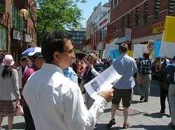 Le défilé a duré une heure et demie et a traversé le Chinatown plusieurs fois. Les participants tenaient beaucoup de nombreuses pancartes en chinois, en anglais et en français exposant la nature perverse du PCC. Des volontaires ont distribué des copies du journal The Epoch Times (La Grande Epoque). Les gens se sont montrés très concernés par les agressions dont ont été victimes les pratiquants de Falun Gong à Flushing, New York.