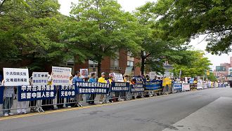 Le rassemblement a eu lieu comme prévu en dépit d’une prévision de pluie abondante. Les participants ont déployé des banderoles sur lesquelles ont pouvait lire : « Le monde a besoin de Vérité – Compassion – Tolérance », « Falun Dafa est bon », « Avez-vous réfléchi sur les raisons du PCC de craindre les personnes qui croient en Vérité – Compassion – Tolérance », « Zhou Yongkang utilise des espions pour propager la haine et persécuter le Falun Gong », « Le consulat général chinois à New York est l’instigateur du groupe pro-communiste chinois qui a attaqué le Falun Gong » et « Le PCC sera détruit par le ciel,, renoncer au PCC pour vous assurer un avenir sûr. »
