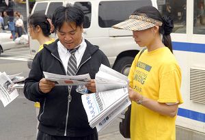Un passant lit l’édition spéciale de la Grande Époque, révélant la vérité derrière les violentes agressions contre les pratiquants du Falun Gong à Flushing