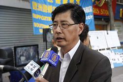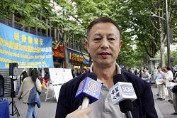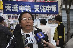 M. Hu, volontaire responsable du Centre d'aide aux démissions a évoqué au micro le dernier tour de la propagande communiste chinoise et les attaques par des voyous à gage d' un autre centre tenu par des pratiquants de Falun Gong à Flushing, New York, ainsi que l'implication du consul général chinois révélée par une conversation téléphonique. Le but étant de détourner l'attention de leur responsabilité dans le désastre du tremblement de terre et d'en profiter pour porter un coup à l'ennemi numéro un le Falun Gong. Il a rappelé aux gens quel genre de pratique traditionnelle est le Falun Gong et quels principes il enseigne et de ne pas être trompé par les mensonges du PCC. Puis indiquant le message sur les banderoles "Le ciel élimine le PCC et le ciel bénit la Chine", il a rappelé comment au cours de ses cinquante de règne, le parti pervers avait assassiné quelques quatre vingt millions de Chinois, et qu'il s'était lui-même condamné par ses crimes. Puis il a encouragé à nouveau la population chinoise à quitter le PCC sans délai pour ne pas être entraîné avec lui dans sa chute.