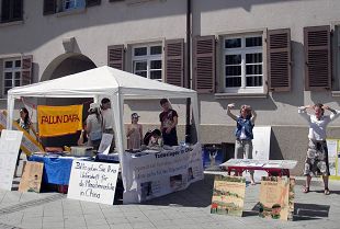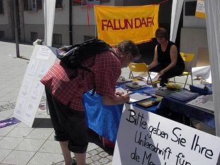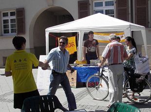 Le 28 juin 2008, dans la ville allemande de Rheinfelden, près de la Suisse, quelques pratiquants de Falun Gong ont installé un bureau d'information avec le thème "Désintégrer et Quitter le Parti communiste." Sur la table était posés une variété d'imprimés et de documents dénonçant les crimes commis par le Parti communiste chinois et présentant le Falun Gong. Il y avait aussi une exposition de photo et des panneaux dévoilant la brutalité du Parti communiste chinois, de sorte que les gens puissent comprendre le Falun Gong.